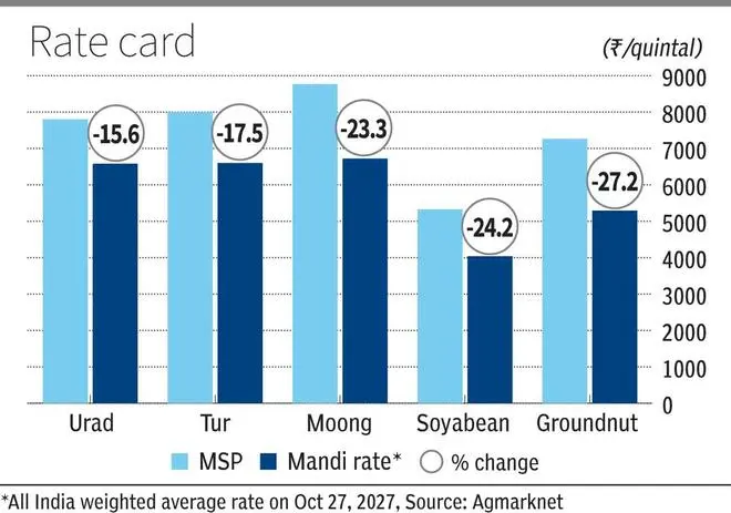 On Monday, the all India weighted average mandi price of moong was ₹6,721/quintal (23 per cent below MSP), urad was ₹6,580/quintal (16 per cent below MSP), tur was ₹6,601/quintal (17 per cent below MSP), soyabean was ₹4,038/quintal (24 per cent below MSP), and groundnut was ₹5,291/quintal (27 per cent below MSP), official data show.