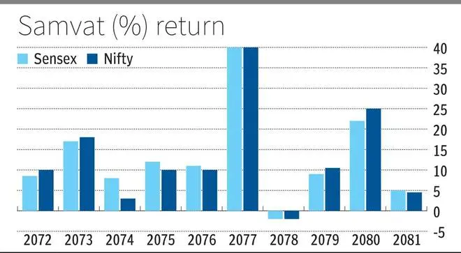 This marked a significant slowdown from the post-Covid rally of Samvat 2077, when both indices surged 40 per cent. The underperformance also paled compared to Samvat 2075’s 12 per cent gain on Nifty and Samvat 2076’s 11 per cent rise.